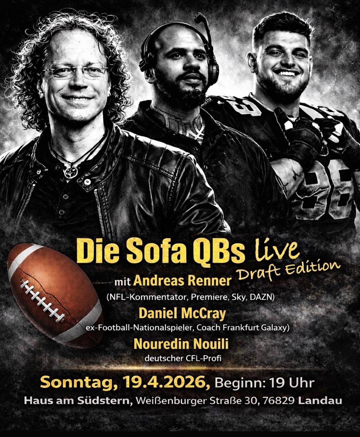 Footballtalk mit Schwerpunkt Draft 2026 mit DAZN Kommentator Andreas Renner, Footballprofi Nouredin Nouili und Defense-Trainer der Frankfurt Galaxy Daniel McCray. Organisiert von Andreas Renner im Haus. Hier könnt ihr in lockerer Athmosphäre Profis zuhören, Fragen stellen und eure Meinung einbringen. Prefektes Programm für einen gemütlichen Wochenendausklang. Einlass 19:00 Uhr, Beginn 19:15 Uhr. Eintritt frei.